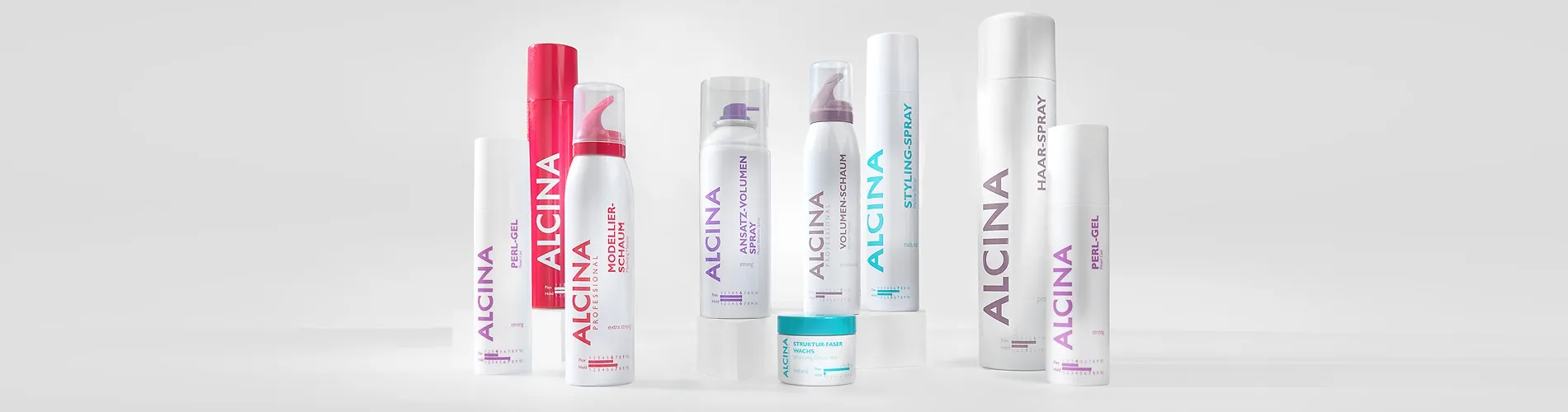 Alcina Professional include tutti i prodotti per le tecniche classiche di styling e finish. Tra questi troviamo il fissatore per capelli, la lozione per il brushing, la lacca, lo spray fissante e la mousse volumizzante.