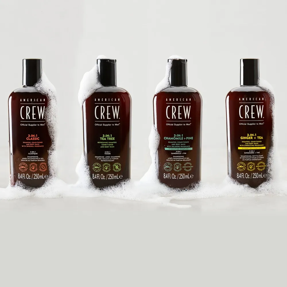 - American Crew 3-in-1 Tea Tree: shampoo, balsamo e gel doccia in un unico prodotto, per una pelle morbida e un profumo rinfrescante.