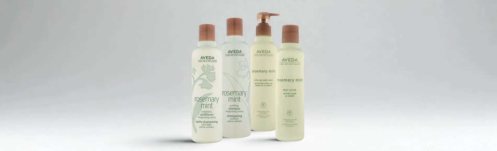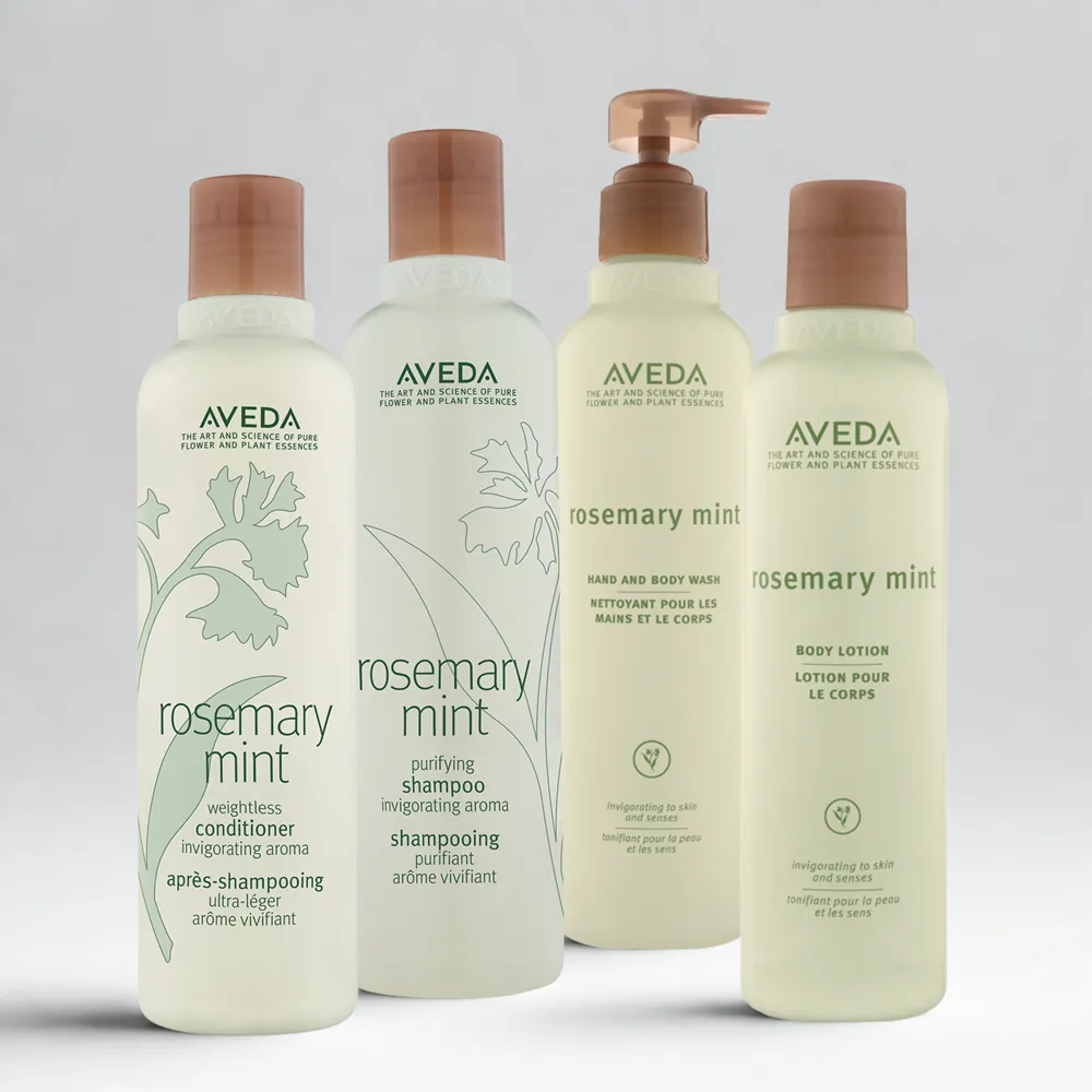 Sia i prodotti per la cura dei capelli sia quelli per il corpo della linea Aveda Rosemary Mint coccolano con rosmarino e menta piperita biologici. A seconda del prodotto, nei trattamenti per capelli si aggiunge anche menta verde, mentre i prodotti per il corpo contengono ulteriori essenze pure di fiori e piante.