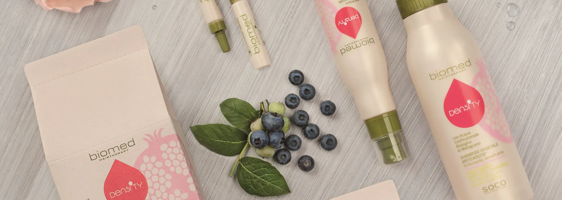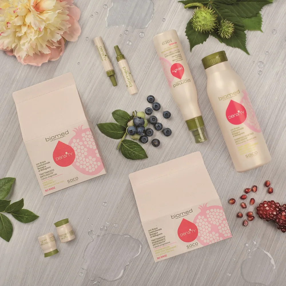 I prodotti Biomed Density rinforzano e infoltiscono i capelli indeboliti, contribuendo così a prevenire la caduta dei capelli. L’ingrediente principale è l’acqua cellulare biologica di melograno, che favorisce in modo particolare la crescita dei capelli grazie alle sue proprietà antiossidanti e ricche di vitamine. Altri ingredienti vegetali contribuiscono a rafforzare il capello alla radice.