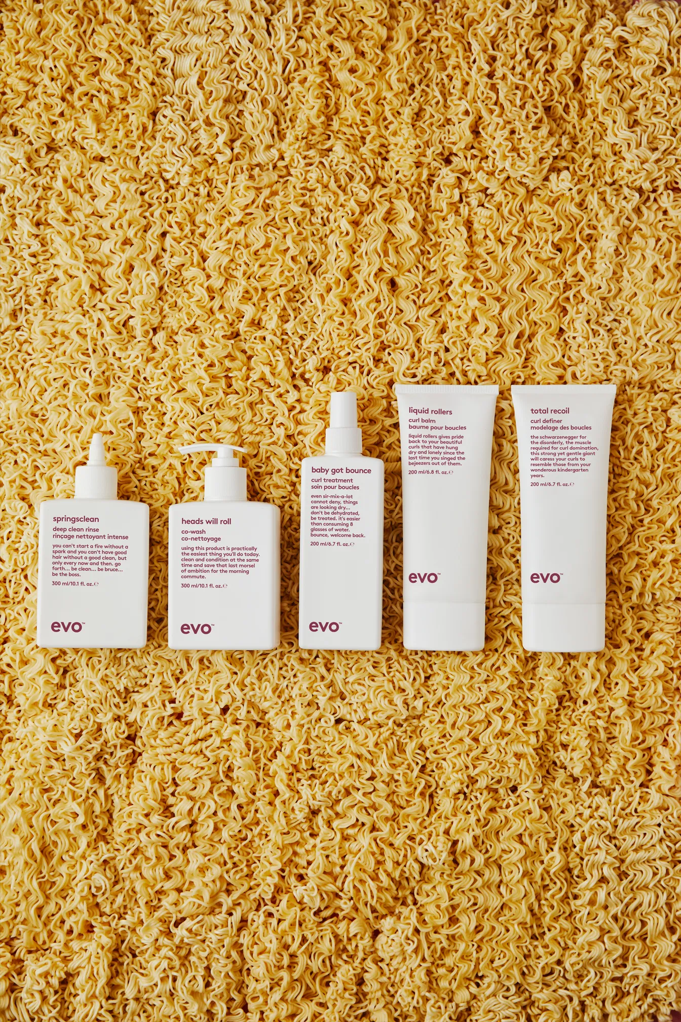 evo curl è una linea di prodotti per la cura dei capelli con cinque articoli dedicati a ricci e onde. Una caratteristica della marca evo hair sono le brevi aneddoti scritti sulle bottiglie dei prodotti.
