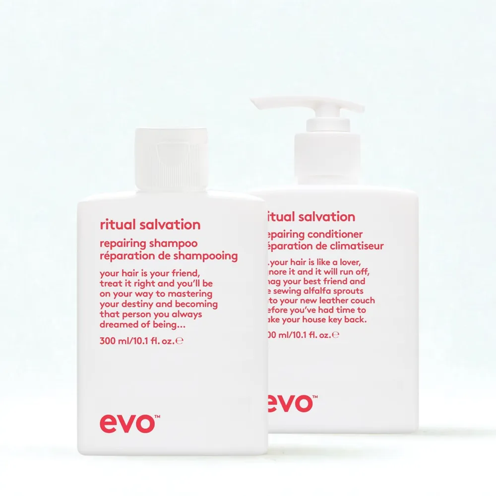 - Prenditi cura dei tuoi capelli con evo Ritual Salvation Repairing Conditioner. Il conditioner viene applicato sui capelli umidi, lasciato agire per due minuti e poi risciacquato. Una volta alla settimana, per un trattamento ancora più intensivo, si consiglia di sostituirlo con evo Mane Attention Protein Treatment.