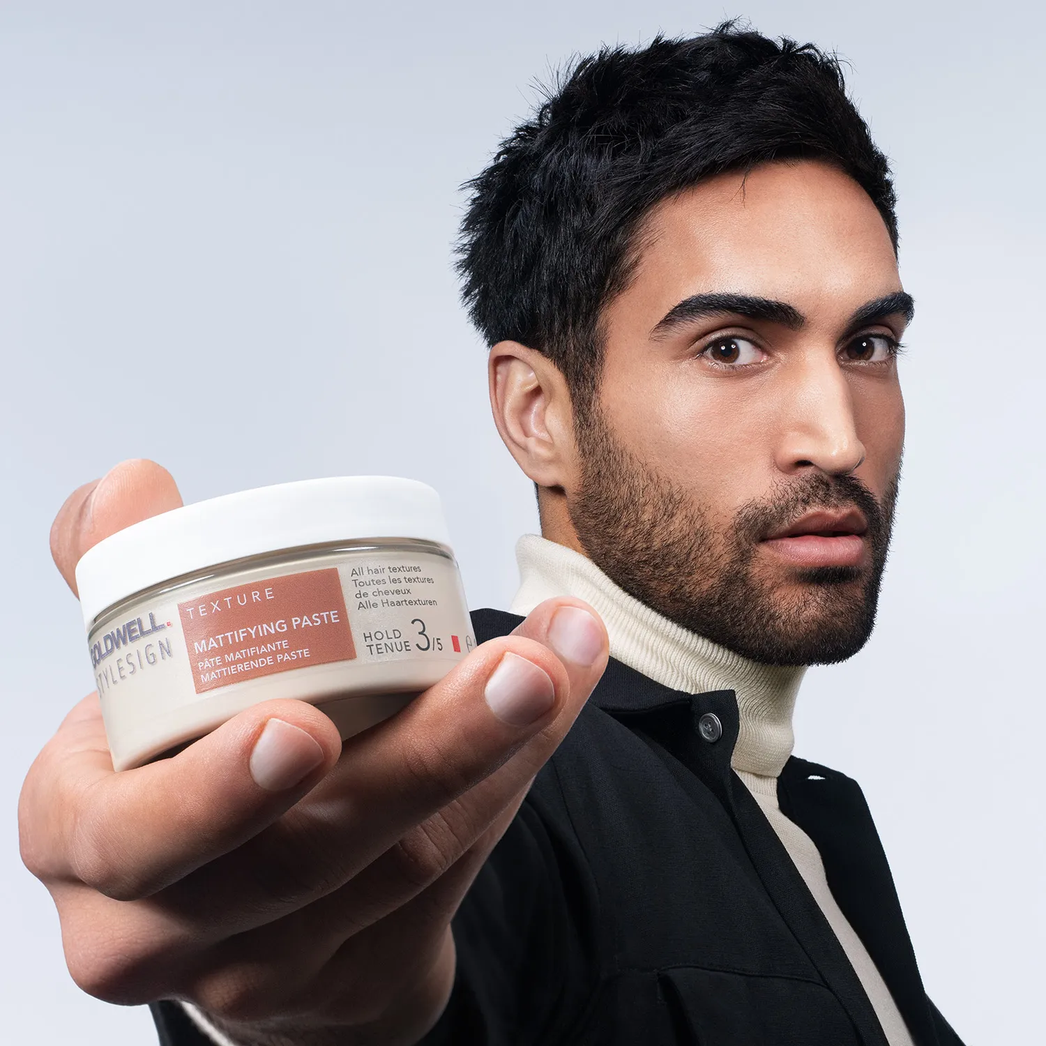 Goldwell Stylesign Texture Roughman Texturizing Paste è una pasta modellante che conferisce texture a tutti i tipi di capelli. Offre una tenuta molto buona e duratura fino a 72 ore per capelli da medi a forti. La pettinatura appare quindi più naturale e non unta. Che si tratti di Taper Fade, Wolf Cut, Beach Look o Out of Bed Look, il Roughman è il tuo talento versatile per stili opachi. Sono stati utilizzati almeno il 26% di materiali PCR per questa confezione. Grazie alla riduzione del peso, a un materiale più sottile e a un tappo più piccolo si genera meno rifiuto di imballaggio. Applicazione di Goldwell Stylesign Texture Roughman Texturizing Paste La pasta può essere utilizzata sui capelli asciutti e garantisce sempre una tenuta forte. Basta lavorarla nei capelli e modellare con le dita.