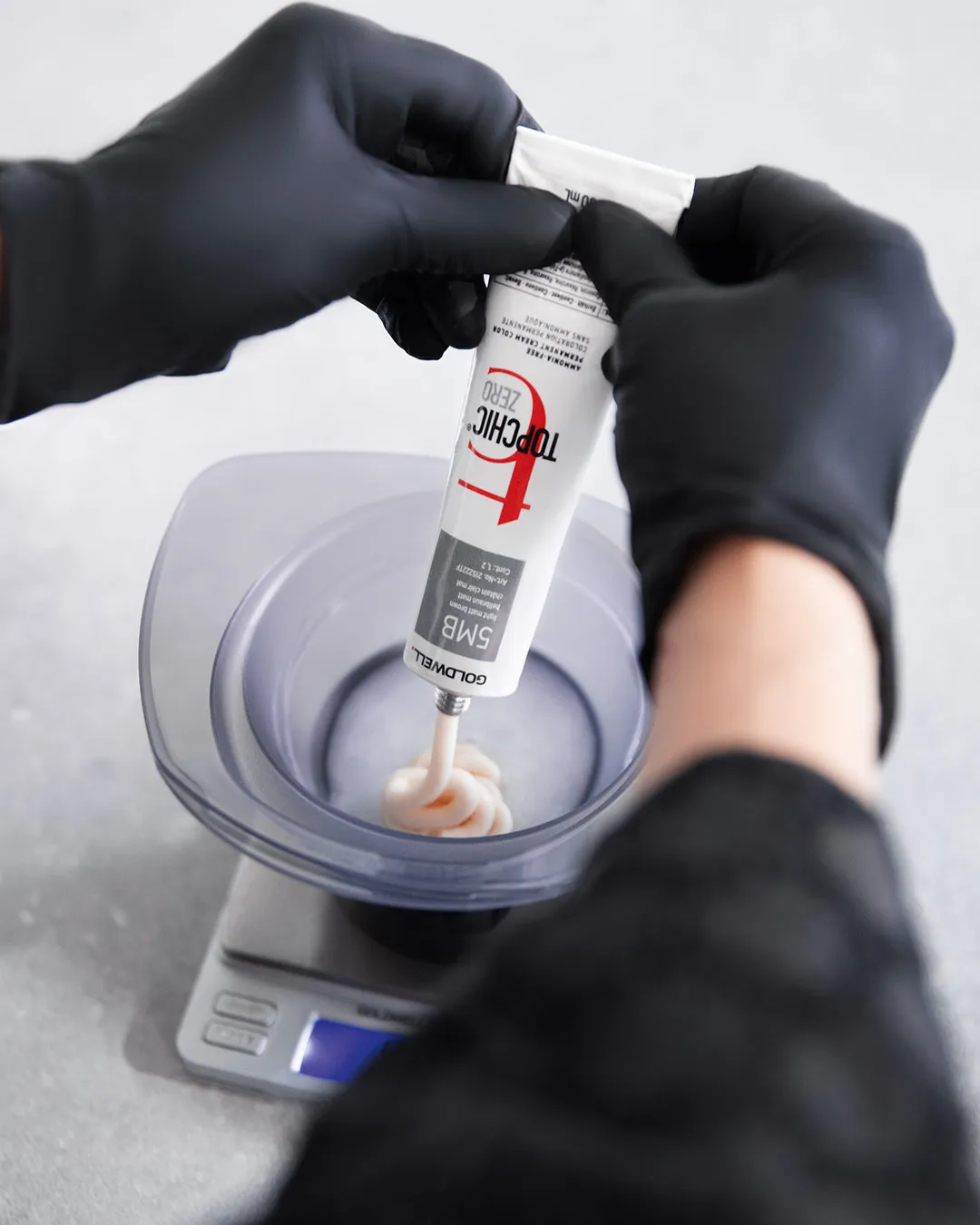 I rapporti di miscelazione esatti per ottenere il risultato desiderato sono riportati sulle confezioni. L’applicatore dosatore Goldwell Topchic aiuta a misurare la quantità di colore e ossidante.