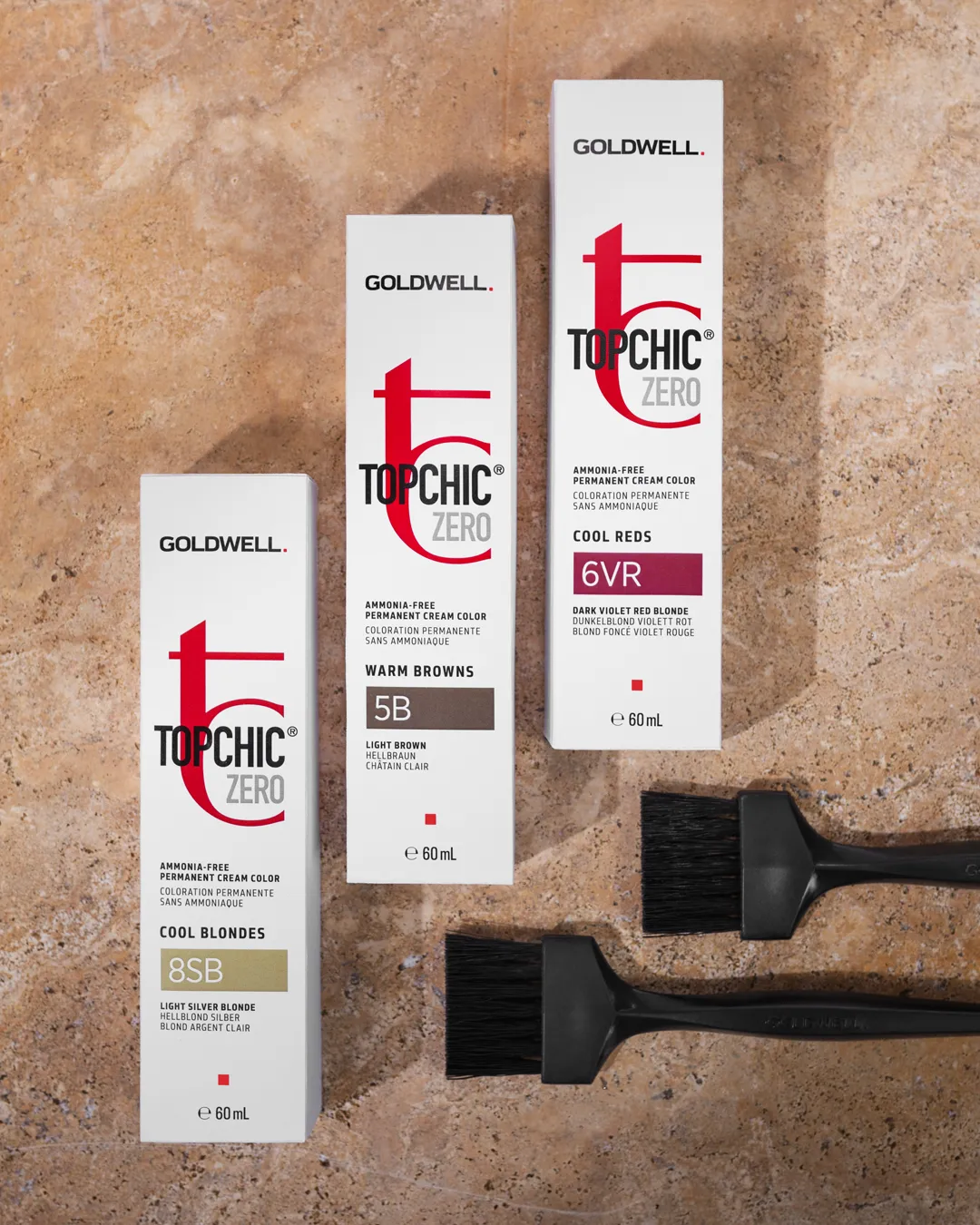- Applicare con un pennello da colorazione: Per la prima colorazione, applicare prima sulle radici e dopo alcuni minuti sul resto dei capelli. Per il ritocco delle radici, applicare Topchic solo sulla ricrescita e utilizzare Goldwell Colorance sulle lunghezze per uniformare il colore.