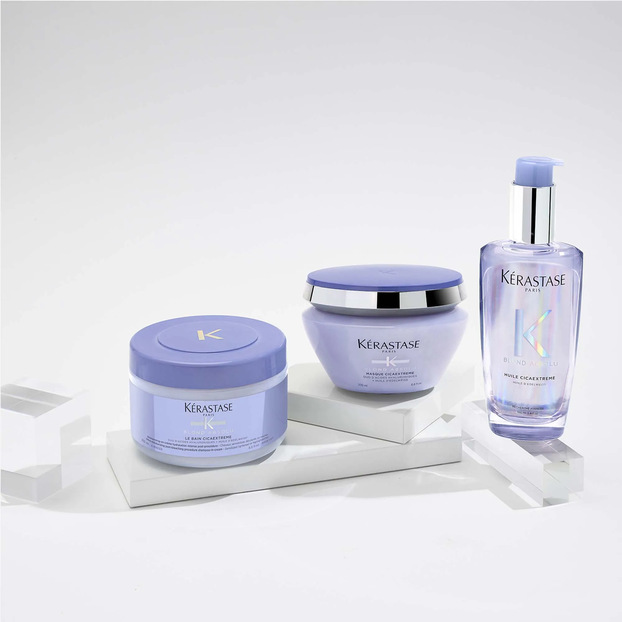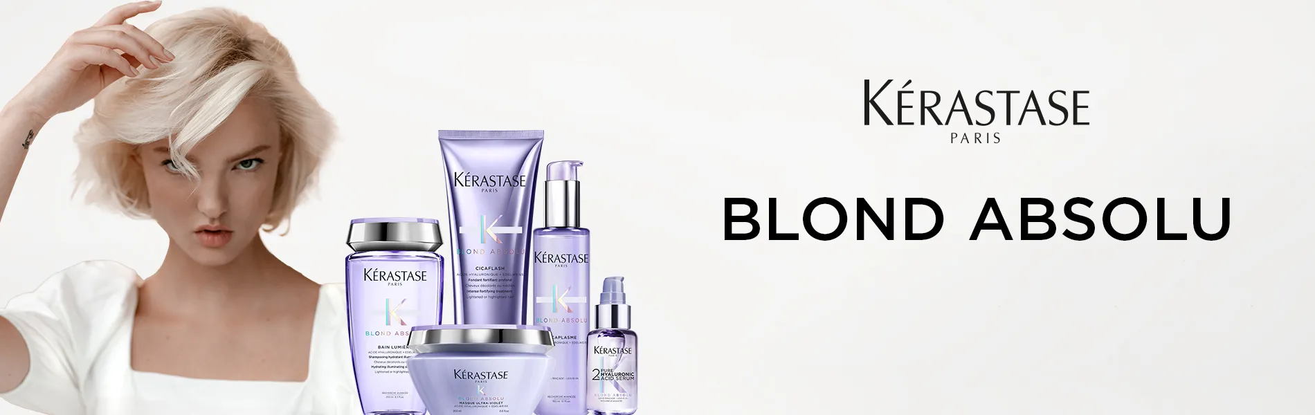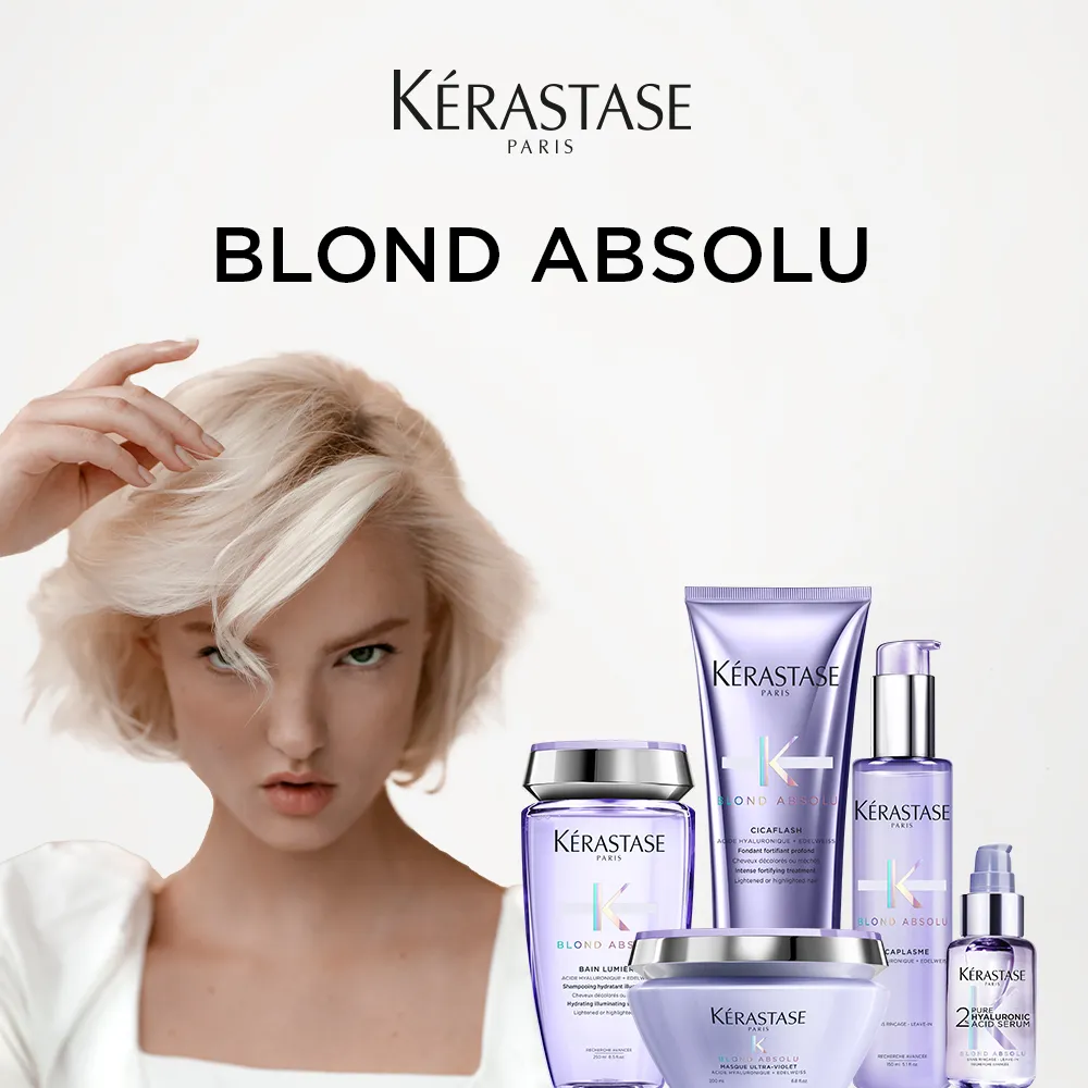 Dall’anti-giallo Kérastase Blond Absolu Bain Ultra-Violet, allo shampoo illuminante Kérastase Blond Absolu Bain Lumière, al Kérastase Blond Absolu Cicaflash Conditioner, alla maschera anti-giallo Kérastase Blond Absolu Masque Ultra-Violet e al Kérastase Cicaplasme Leave-In, la linea offre un programma di cura completo per capelli biondi sensibilizzati.