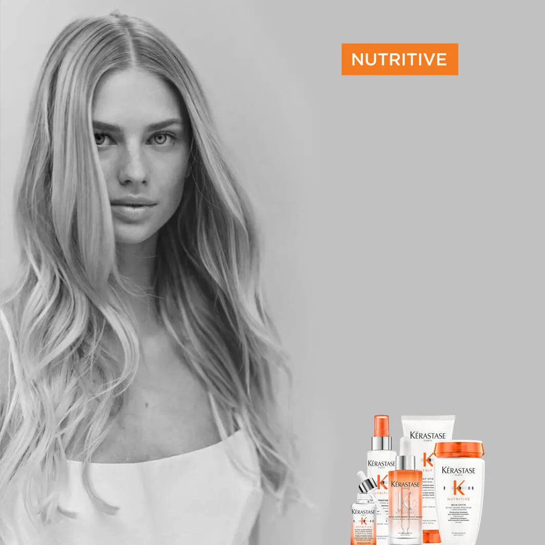 La famiglia Nutritive di Kérastase è mirata ai sintomi tipici dei capelli secchi e carenti di nutrienti, donando alla chioma, grazie a una routine di trattamento personalizzata in base al grado di secchezza, morbidezza, lucentezza e una sensazione di straordinaria leggerezza. Nutritive costituisce la base per il trattamento dei capelli secchi. La linea comprende prodotti su misura per ogni tipo di capello. Dallo shampoo Kérastase Nutritive al conditioner e alla maschera, fino al latte trattante, al siero notturno, a un siero per le punte e alla protezione termica universale, tutti i prodotti sono studiati per soddisfare le esigenze dei capelli secchi. I trattamenti di alta qualità restituiscono morbidezza, vitalità e brillantezza. Dopo l’applicazione, i capelli appaiono più freschi e sani.