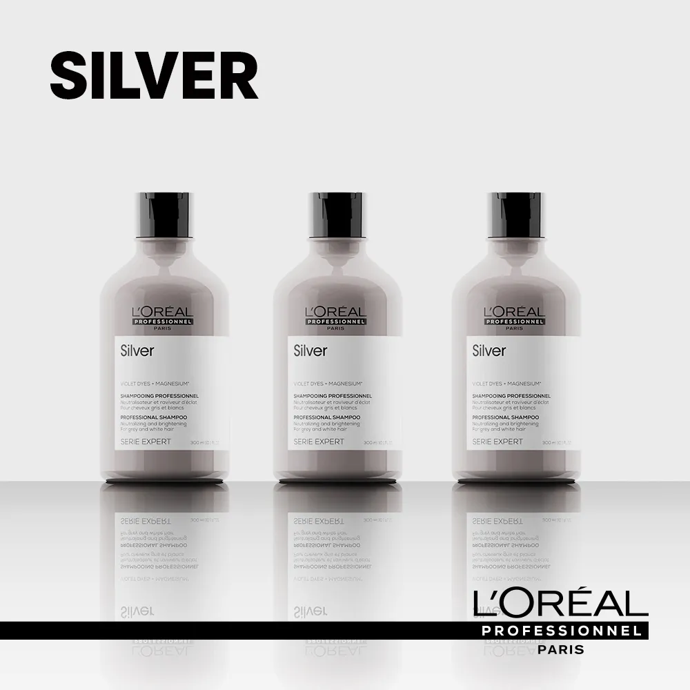 L’Oréal Professionnel Série Expert Silver comprende il trattamento professionale per i capelli naturali grigi e bianchi. La linea include lo Shampoo L'Oréal Série Expert Silver, che agisce in modo mirato contro i riflessi gialli. Magnesio e pigmenti coloranti viola diretti aiutano i capelli a mantenersi luminosi, chiari e fedeli al colore.