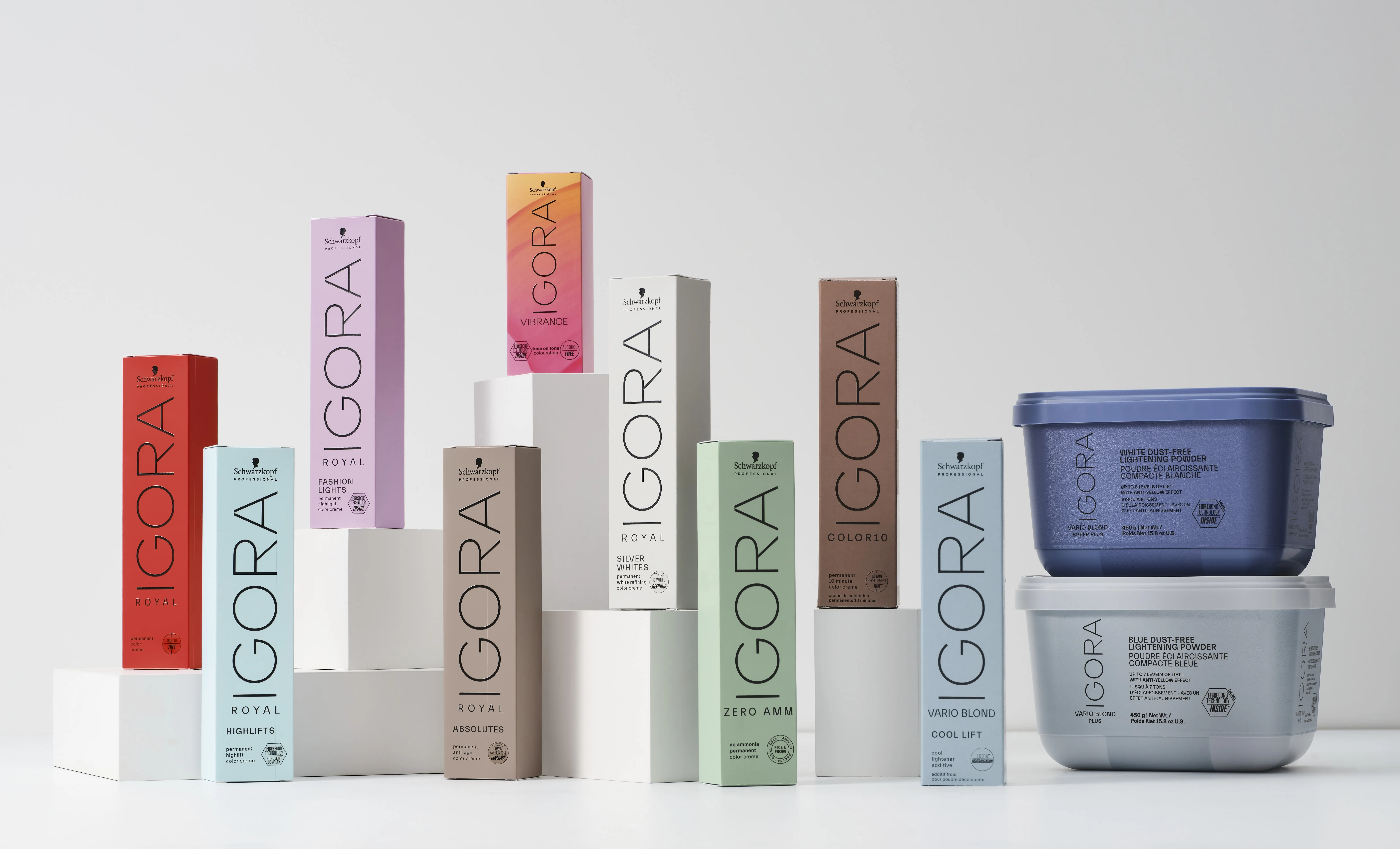 Dalla linea Igora Royal derivano prodotti come Vario Blond, perfetto per ottenere tonalità biondo fredde, e Highlifts, che creano sfumature extra chiare e luminose.