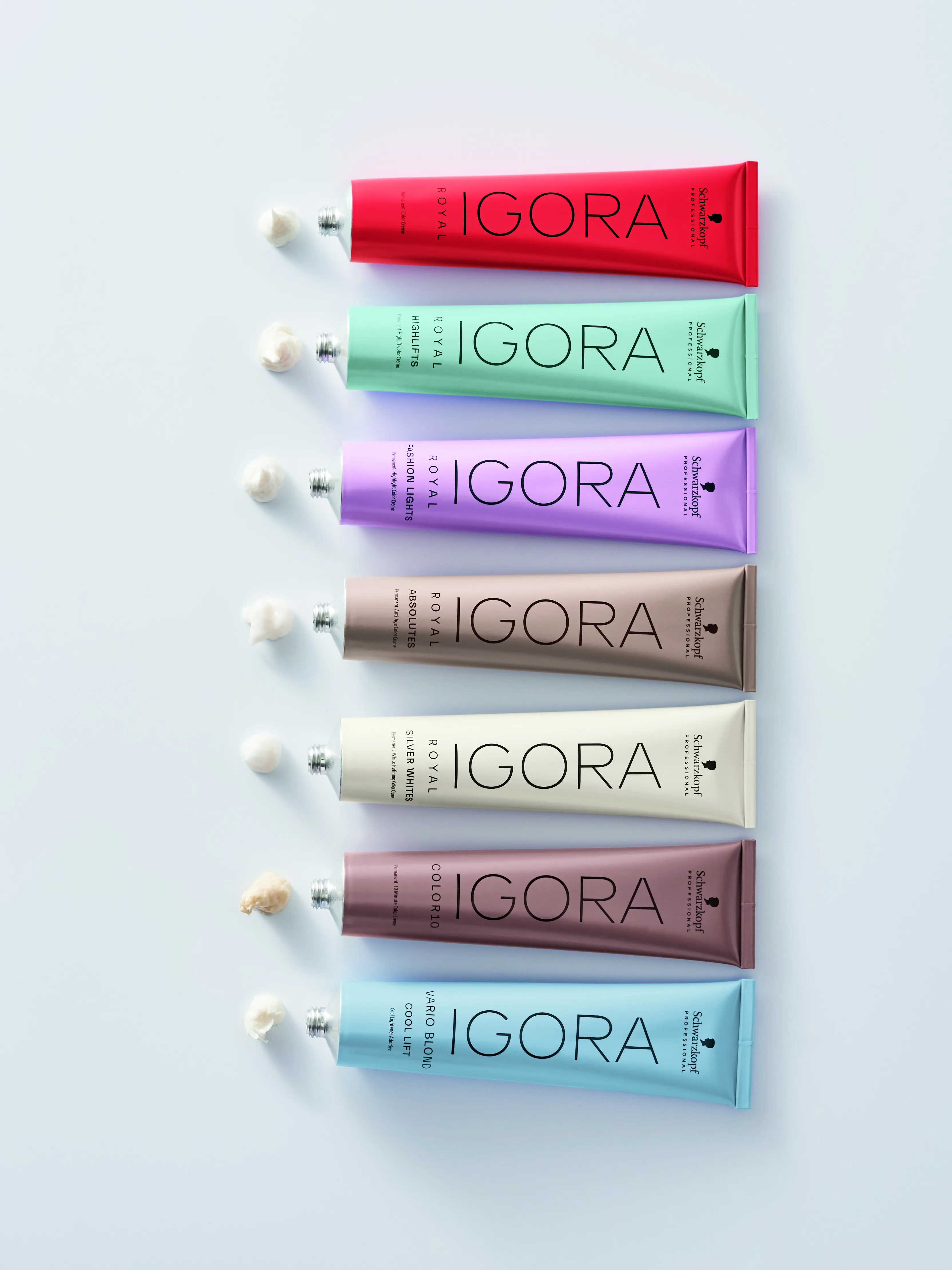 Le colorazioni di alta definizione Igora Royal sono colorazioni permanenti disponibili come crema colorante classica Igora Royal per tutti i tipi di capelli. Per capelli più maturi con un aumento di grigio e bianco, ci sono le seguenti varianti: Schwarzkopf Igora Royal Absolutes, Schwarzkopf Igora Royal Absolutes Silverwhite e Schwarzkopf Igora Royal Absolutes Age Blend. Per chi ama tonalità fredde e polverose, ci sono edizioni speciali come Schwarzkopf Igora Royal Earthy Clay, Schwarzkopf Igora Royal Ashy Cedar e Schwarzkopf Igora Royal Nude Tones. Per creare tonalità bionde estremamente fredde, ci sono Schwarzkopf Igora Royal Highlifts e per tonalità beige sabbiose, Igora Royal Muted Deserts.