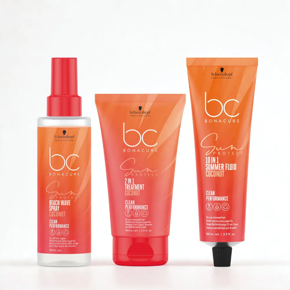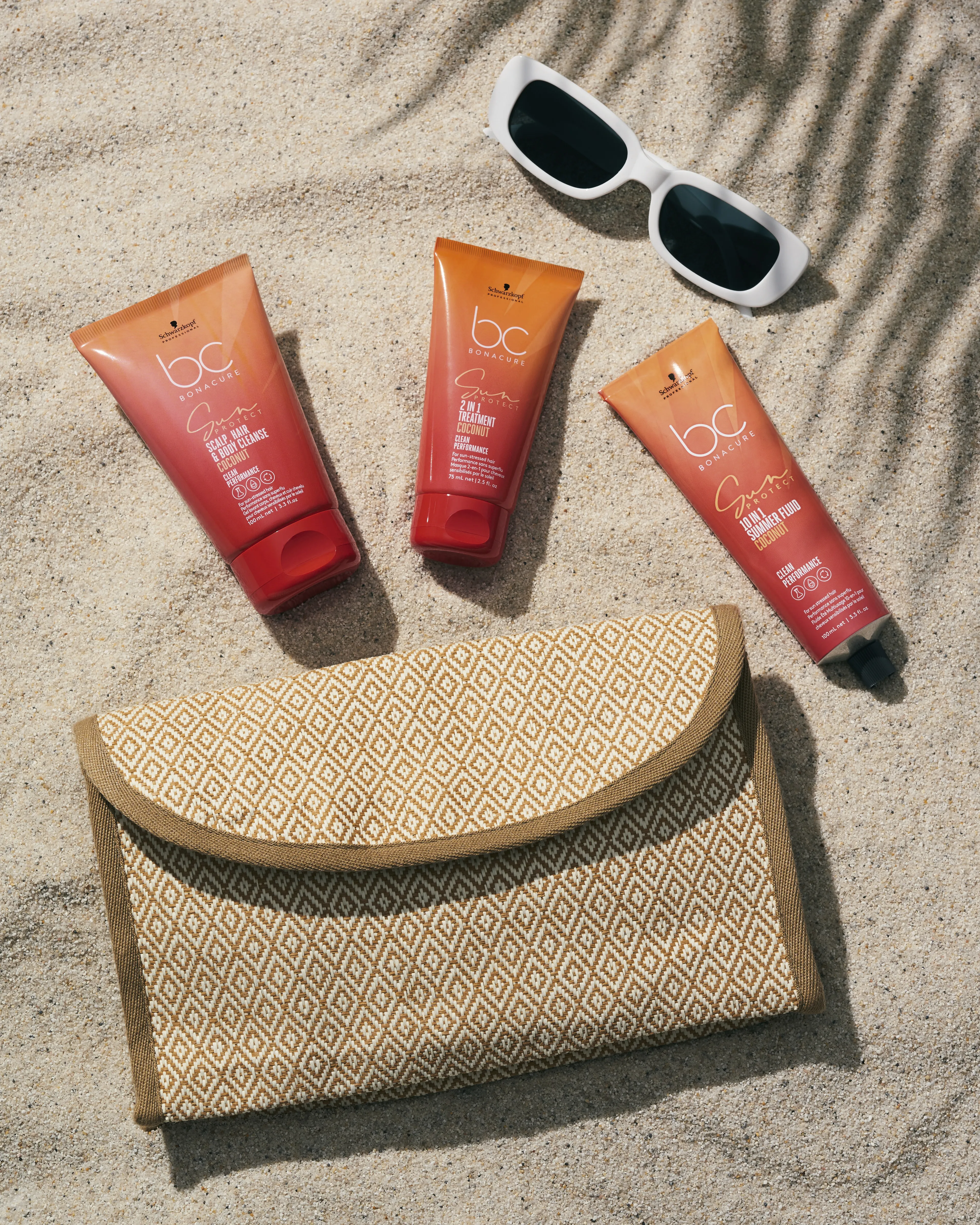- Protezione & Styling: durante l’esposizione al sole, applica più volte al giorno il Schwarzkopf BC 10-in-1 Fluid per proteggere lunghezze e punte. Concludi con lo Spray Beach Waves BC Sun Protect per un perfetto look estivo.