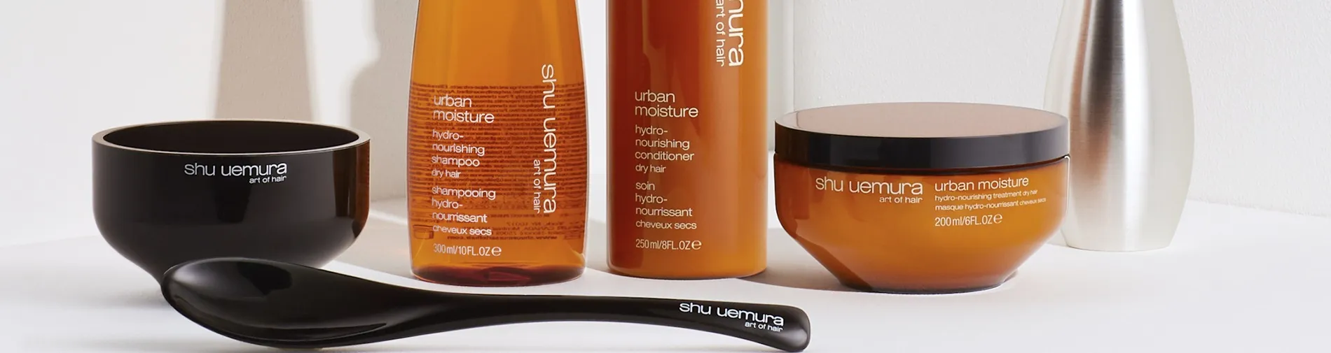 Shu Uemura Urban Moisture è la linea di trattamento di lusso per capelli secchi. Soprattutto nella vita urbana quotidiana, i capelli sono esposti a aggressioni quotidiane e necessitano di un trattamento intensivo per contrastare l'accumulo di inquinanti urbani.
